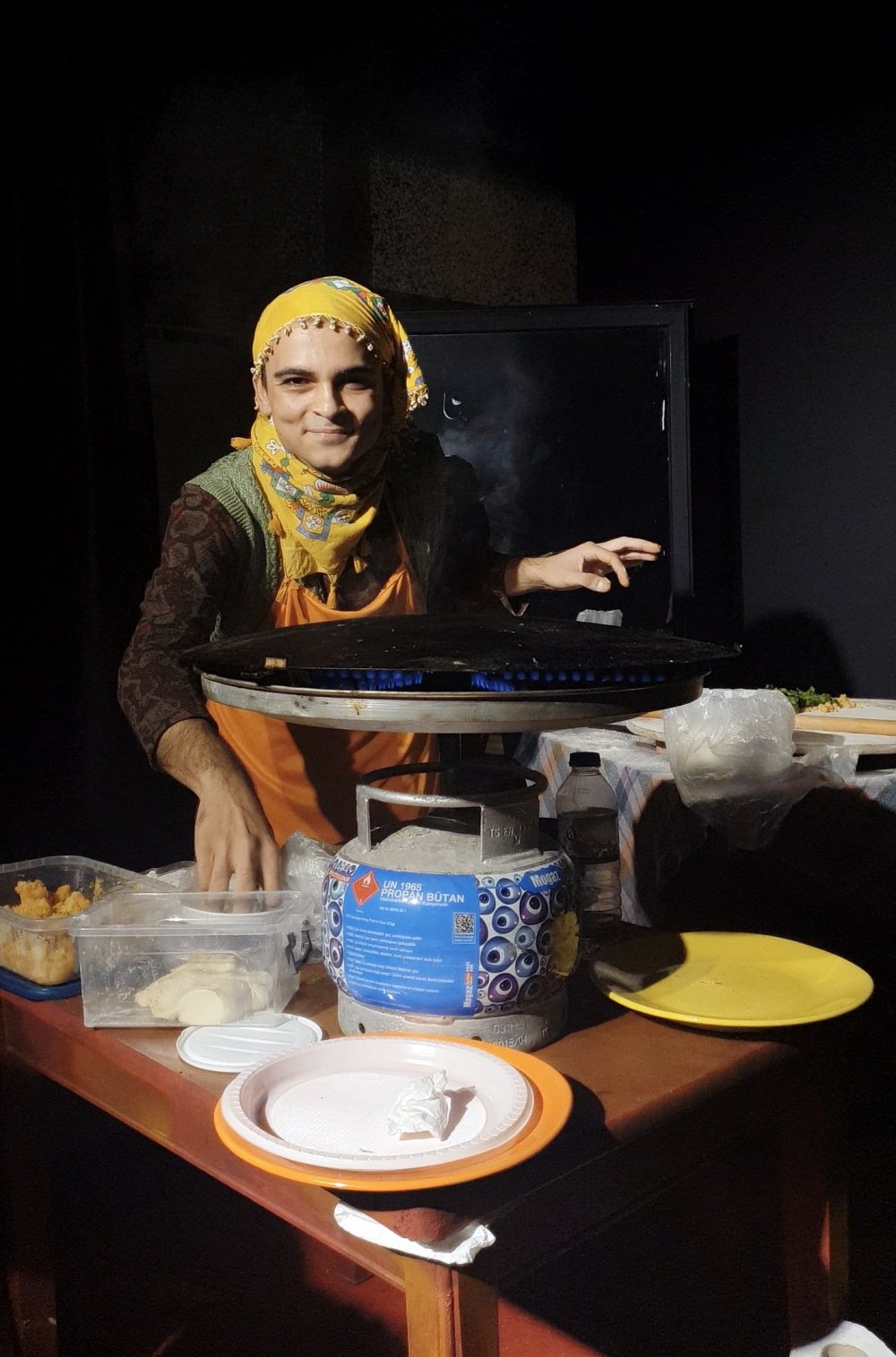 Her oyun öncesi, seyircilere kendi elleriyle yaptığı ıspanaklı, kaşarlı ve patatesli gözlemeleri ikram ediyor.