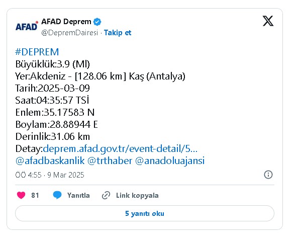 Afet ve Acil Durum Yönetimi Başkanlığı (AFAD) verilerine göre, Antalya açıklarında 3.9 büyüklüğünde bir deprem meydana geldi.